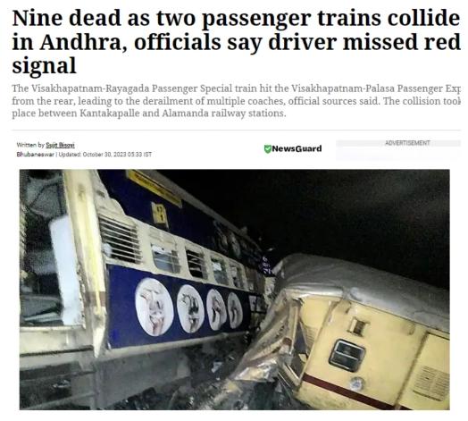 據(jù)報道,當天,一列從安得拉邦的維薩卡帕特南開往奧迪沙邦的客運列車,與同軌道上從維薩卡帕特南駛向帕拉薩的客運列車相撞,事故造成數(shù)節(jié)車廂脫軌。