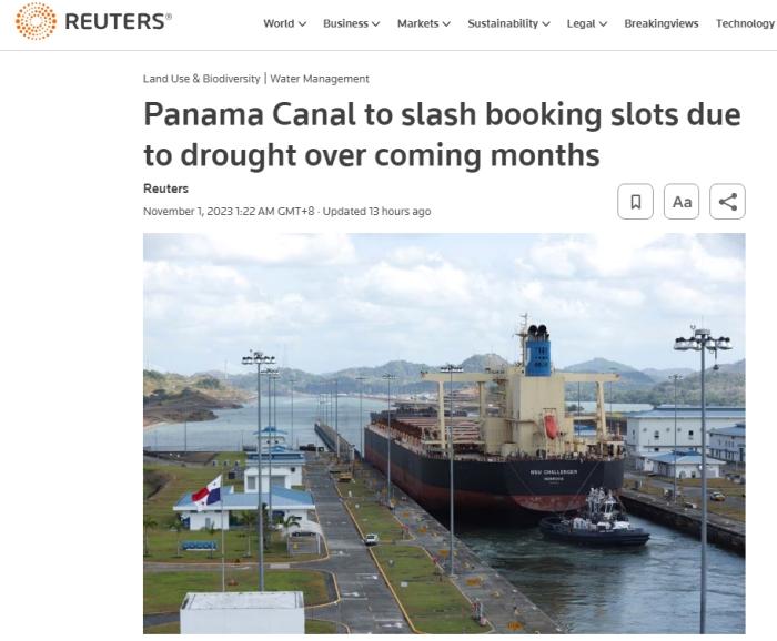 據(jù)報道,巴拿馬運河管理局(ACP)在10月30日晚間的公告中表示,從11月3日開始,巴拿馬運河的通行名額將從每天31個減少到每天25個,并將在未來三個月內(nèi)逐步減少,計劃到2024年2月減少為每天18個名額。