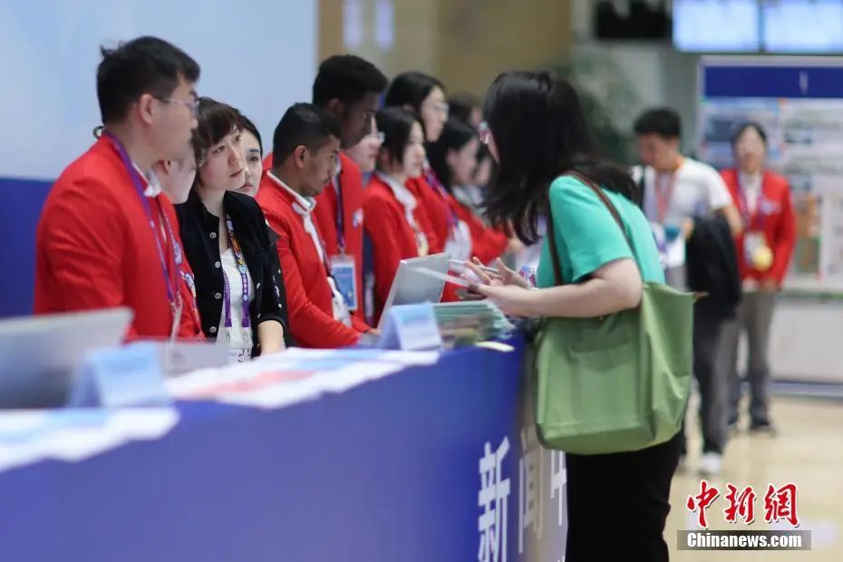 11月4日,位于上海國家會展中心的進博會新聞中心正式啟用,志愿者在新聞中心為記者服務。中新社記者 盛佳鵬 攝