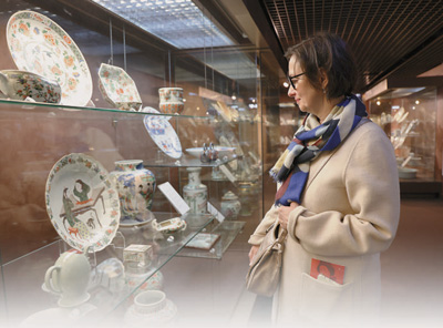 法國(guó)游客在欣賞中國(guó)瓷器。