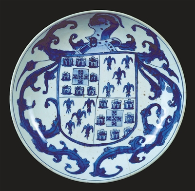 與此同時(shí),葡萄牙貴族開(kāi)始向中國(guó)專(zhuān)門(mén)定制紋章瓷器。據(jù)博物館陶瓷收藏館館長(zhǎng)拉斐爾·阿爾費(fèi)寧介紹,定制瓷器在葡萄牙的最早記載出現(xiàn)于1528年,即明代嘉靖年間。葡萄牙人非常珍視這些中國(guó)瓷器,甚至在返程途中給它們加飾銀制配件。由于當(dāng)時(shí)歐洲人多使用質(zhì)地粗糙的石制或陶制用具,設(shè)計(jì)獨(dú)特、淡雅脫俗且白皙光潔、能耐高溫的中國(guó)瓷器脫穎而出,備受珍視。當(dāng)時(shí),葡萄牙貴族多以中國(guó)瓷器為地位的象征,定制瓷器一時(shí)間蔚然成風(fēng)。其中,由葡萄牙阿爾布克爾克家族定制的瓷盤(pán)尤具代表性:盤(pán)心繪有盾形紋章,配以十字形盾牌和百合花,藍(lán)白相間,光潔細(xì)膩。這件瓷器珍品既是歐洲藝術(shù)史上的美麗篇章,亦是中葡藝術(shù)交融出的靈感結(jié)晶。