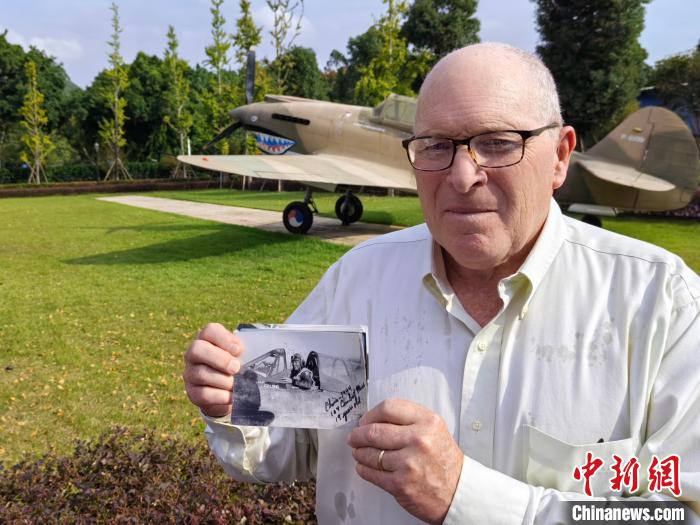 11月4日,在廣西柳州市飛虎隊遺址里,飛虎隊后代小克利福德·隆在一架復刻的戰(zhàn)機前展示父親的照片。劉俊聰 攝