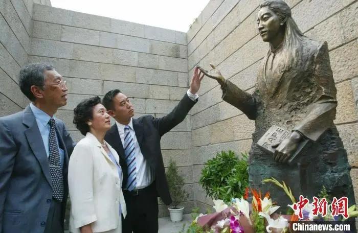 2005年,侵華日軍南京大屠殺遇難同胞紀(jì)念館內(nèi),張紹進(jìn)、張盈盈(左)為女兒張純?nèi)绲袼芙夷弧?資料圖) 中新社記者 泱波 攝
