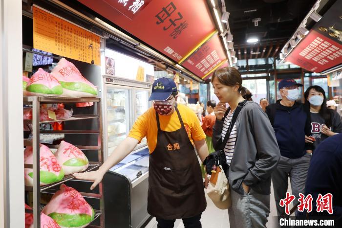 正式開(kāi)張首日,各攤商早早地布置好店面。記者在市場(chǎng)一樓看到,立家湖州粽店的粽子等美食香氣四溢,購(gòu)買民眾排起長(zhǎng)隊(duì);合興糕團(tuán)店的巨大壽桃上有“?!薄暗摗薄吧湛鞓?lè)”等字,吸引顧客拍照;大連食品店整齊擺著各類堅(jiān)果,并掛著湖南臘腸、廣東臘肉等熟食。