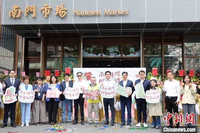 11月16日,經(jīng)過(guò)四年改建的臺(tái)北南門市場(chǎng)正式重新開(kāi)業(yè),圖為出席開(kāi)幕式的嘉賓剪彩后合影?!≈行律缬浾?陳小愿 攝