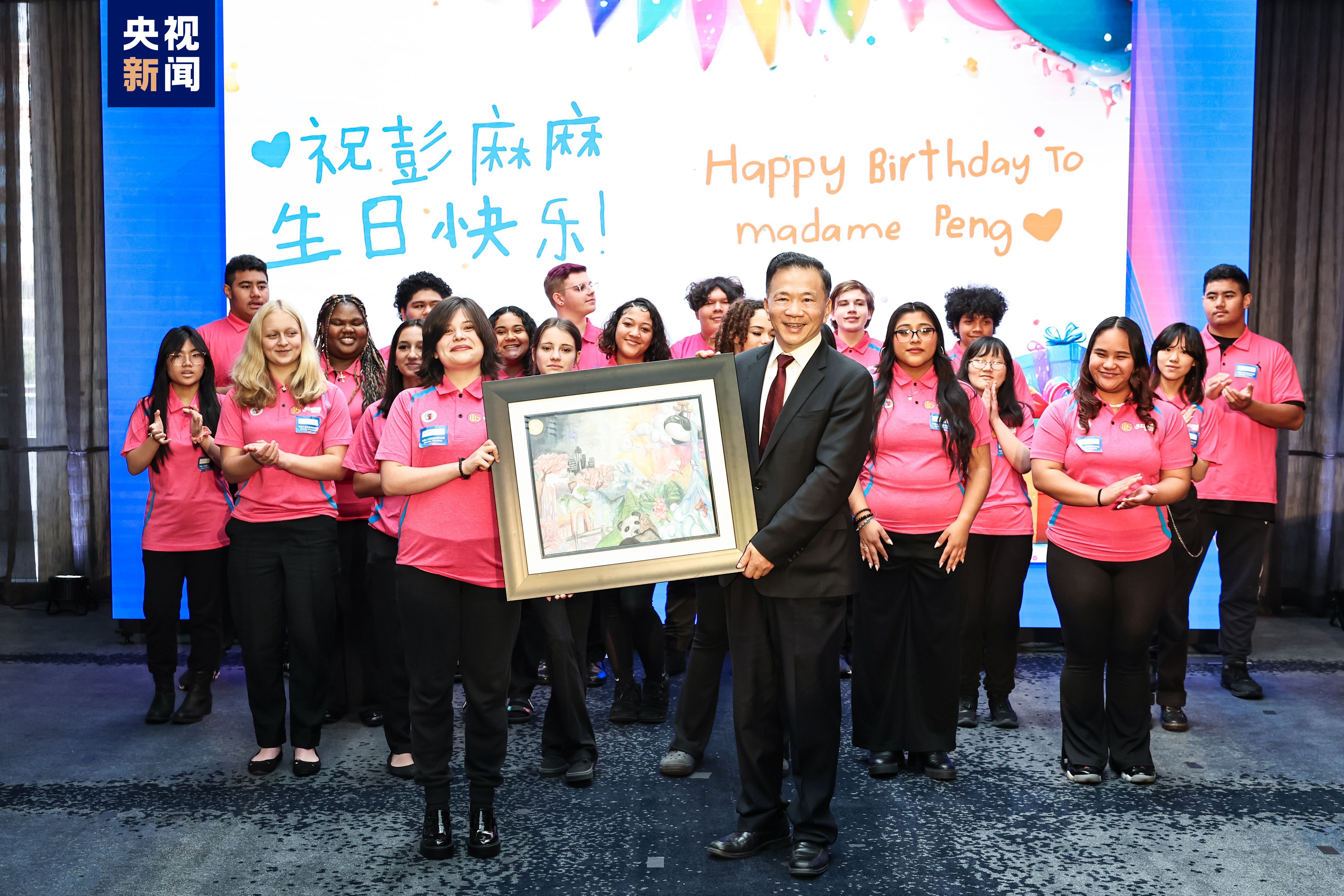 活動現(xiàn)場,來自華盛頓州林肯中學的合唱團演唱了中文歌曲《在希望的田野上》和英文歌曲《伴我同行》,祝愿中美友誼的紐帶更加牢固,煥發(fā)新的活力。同學們還為習近平主席和夫人彭麗媛精心準備了手繪畫作《一起向未來》,并用精美的生日賀卡和《生日快樂》歌親切地為“彭麻麻”送上了生日祝福。總臺臺長代為接收。