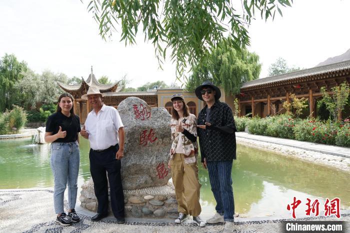 圖為青海省海東市循化縣撒拉族歷史文化地標(biāo)駱駝泉內(nèi),唐一泓(左一)和當(dāng)?shù)刂v解員合影留念。 馬銘言 攝