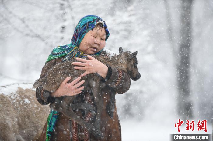 資料圖。圖為2023年4月29日,在內(nèi)蒙古大興安嶺,柳霞在雪中懷抱一頭剛出生不久的馴鹿幼崽?!⊥鮽?攝