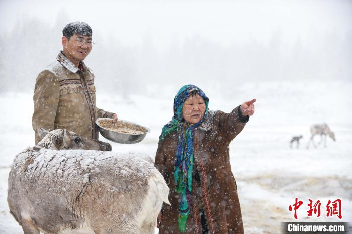 資料圖。圖為2023年4月29日,在內(nèi)蒙古大興安嶺,柳霞與兒子雨果在雪中給馴鹿喂食豆餅?!⊥鮽?攝