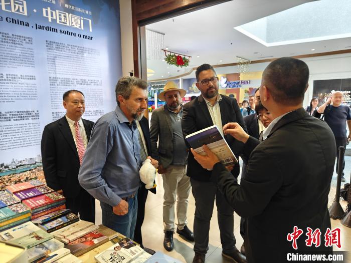 廈門外圖集團(tuán)有限公司工作人員向巴西伊瓜蘇議長(zhǎng)莫拉雷斯(右二)介紹中文書籍。廈門市宣傳部供圖