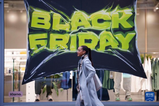 11月22日,在英國(guó)曼徹斯特,一名女子走過“黑色星期五”促銷廣告。新華社發(fā)(喬恩·休珀攝)