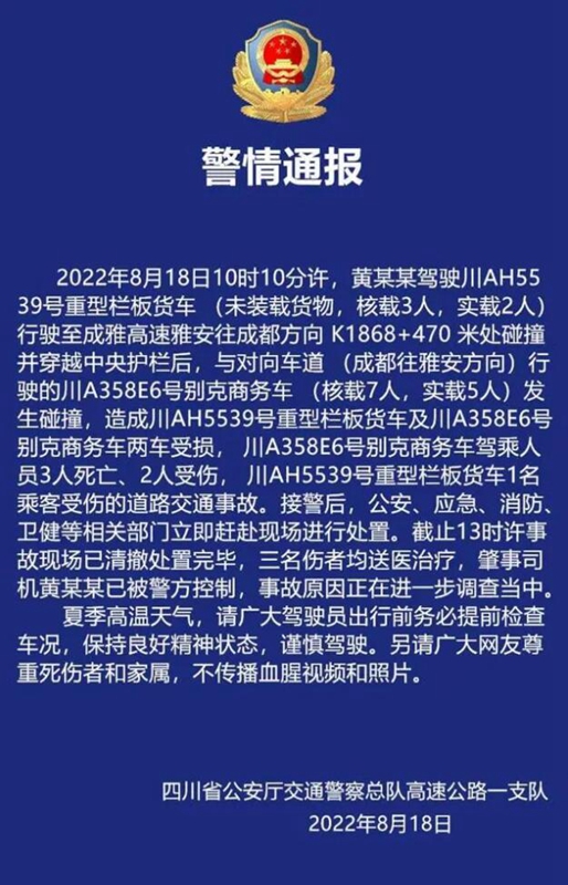 2022年8月18日10時10分許,G5京昆高速公路成雅段K1868公里+150米路段(成都市蒲江縣境內(nèi))發(fā)生川 AH55**貨車沖斷中央護欄與對向正常行駛的川A35***小客車發(fā)生碰撞,造成小客車內(nèi)3人當(dāng)場死亡,小客車內(nèi)2人和大貨車內(nèi)1人受傷、2車及高速公路路產(chǎn)受損的道路交通事故,直接經(jīng)濟損失約350萬元。