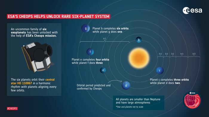 美國(guó)國(guó)家航空航天局(NASA)的“凌日系外行星巡天衛(wèi)星”(TESS)在2020年和2022年觀測(cè) HD110067,發(fā)現(xiàn)該恒星亮度的數(shù)次下降,加之來(lái)自“系外行星特性探測(cè)衛(wèi)星”(CHEOPS)的更多觀測(cè),論文第一作者和通訊作者、美國(guó)芝加哥大學(xué)R. Luque與同事及合作者研究認(rèn)為,這些跡象可解釋為6顆行星從恒星前面經(jīng)過(guò)。通過(guò)研究3顆最深處行星,他們計(jì)算了所有6顆行星的軌道,從最深處的約9天,到最外層的約54天。