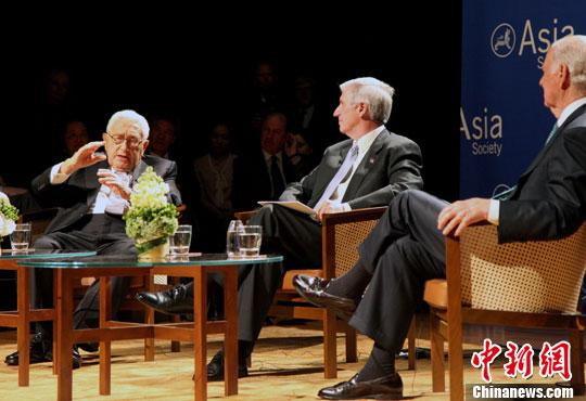 資料圖:美國前國務(wù)卿亨利·基辛格(左)與前國務(wù)卿詹姆斯·貝克等人進行有關(guān)美中關(guān)系的對話。中新社發(fā) 王歡 攝