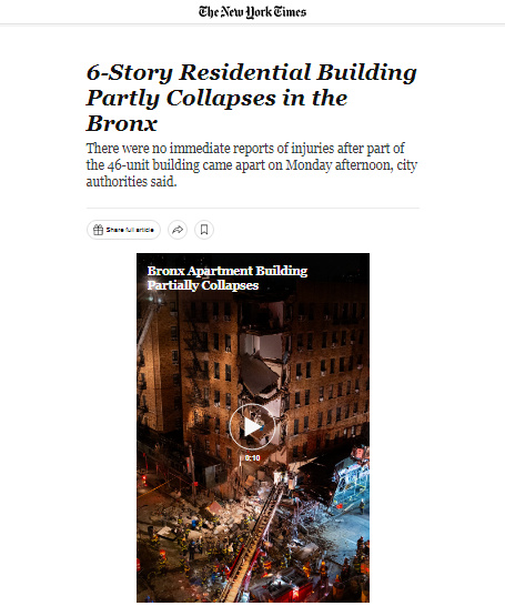 紐約市消防局表示,截至當(dāng)日下午4時(shí)30分,還未有人員傷亡報(bào)告,并稱此次坍塌事件的調(diào)查尚處于初步階段。