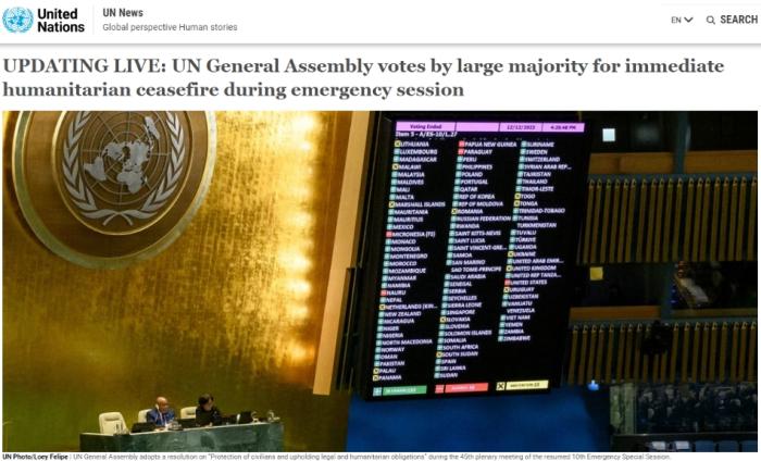 中新網(wǎng)12月13日電 據(jù)聯(lián)合國新聞網(wǎng)消息,當(dāng)?shù)貢r(shí)間12日,聯(lián)合國大會(huì)針對(duì)巴以沖突召開緊急會(huì)議,并討論了一項(xiàng)呼吁加沙立即實(shí)現(xiàn)人道主義?;鸬臎Q議。