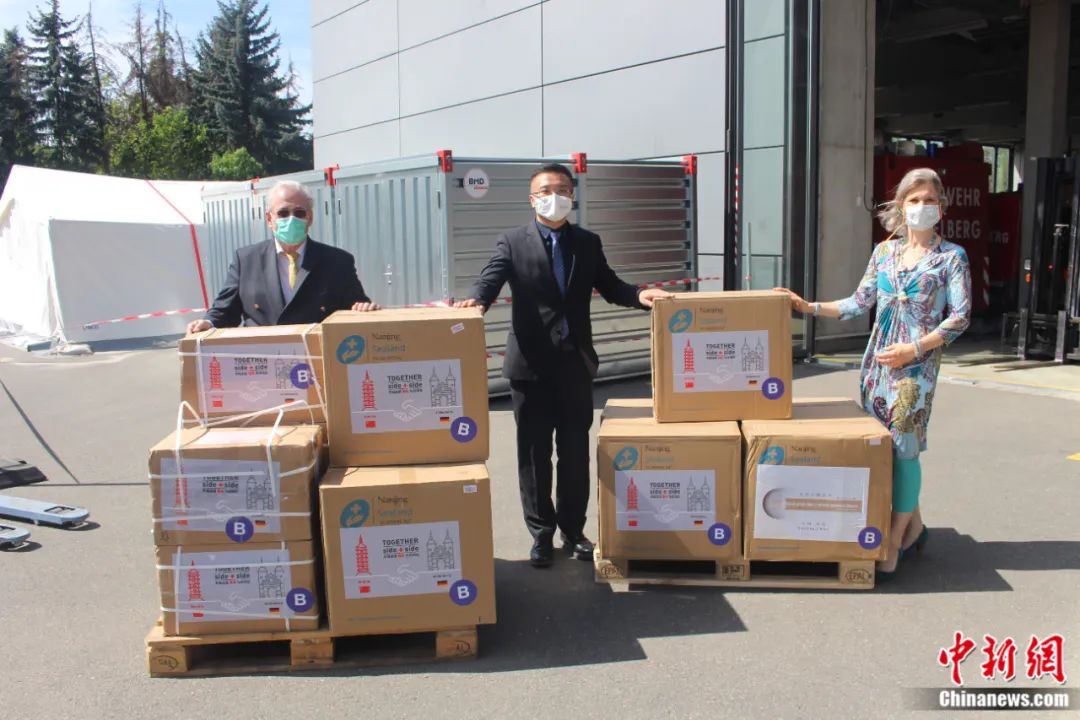 中國駐德大使館接到來信后緊急調(diào)集物資,中國各界紛紛伸出援手——浙江一家醫(yī)藥企業(yè)當即決定免費贈藥,南京市政府同時籌得幾萬只口罩和上百套防護服,通過中國專機運往德國。2020年4月21日,中國駐德大使館工作人員自柏林驅(qū)車700公里,將物資交到了海德堡市政府和托馬斯·拉貝的手中。