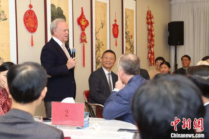 12月16日,加拿大白求恩醫(yī)學(xué)發(fā)展協(xié)會(huì)會(huì)長(zhǎng)艾瑞特(站立者)在招待會(huì)上發(fā)言。中新社記者 余瑞冬 攝