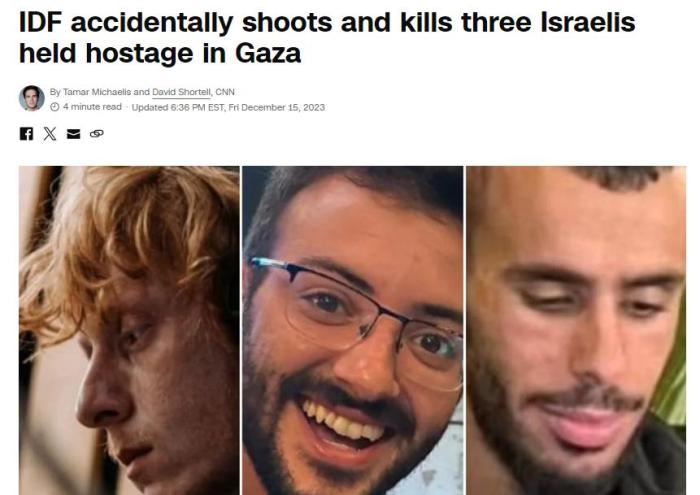據(jù)美國有線電視新聞網(CNN)報道,以色列國防軍發(fā)言人赫格里在新聞發(fā)布會上表示,“在謝賈亞的戰(zhàn)斗中,以色列國防軍錯誤地將三名以方人質視為威脅。軍隊向其開火,他們被打死?!?/p>