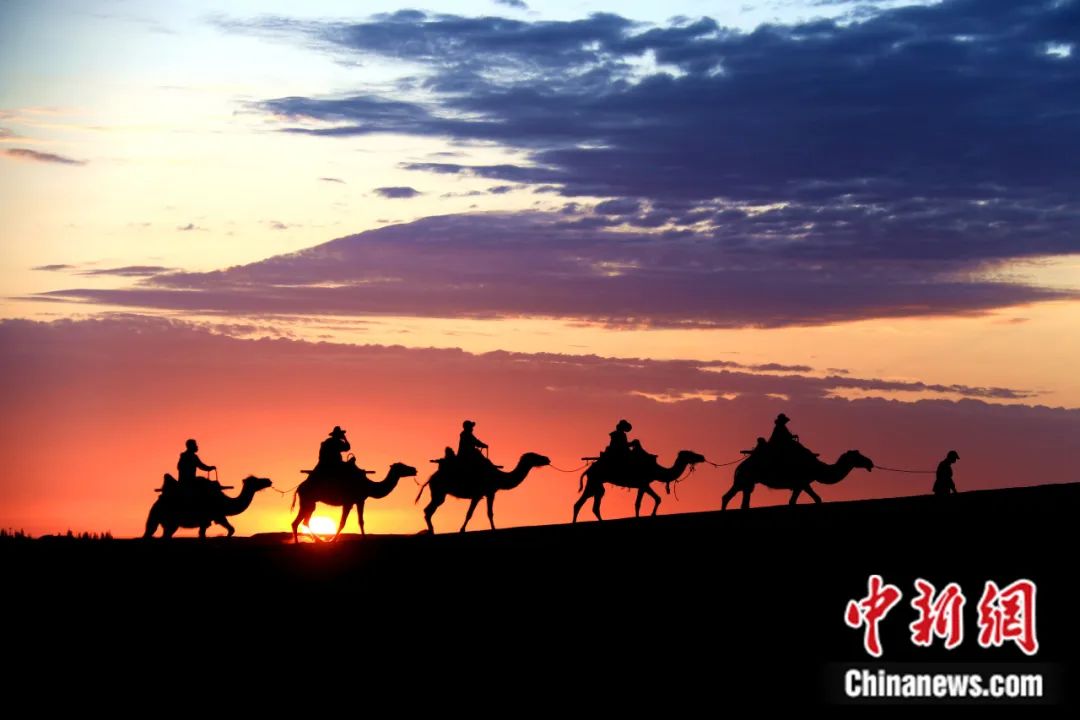 中國甘肅敦煌鳴沙山月牙泉景區(qū)的沙漠駝隊。敦煌是古代絲綢之路上的重鎮(zhèn),歷史上東西方文化交匯的重要樞紐。張曉亮 攝