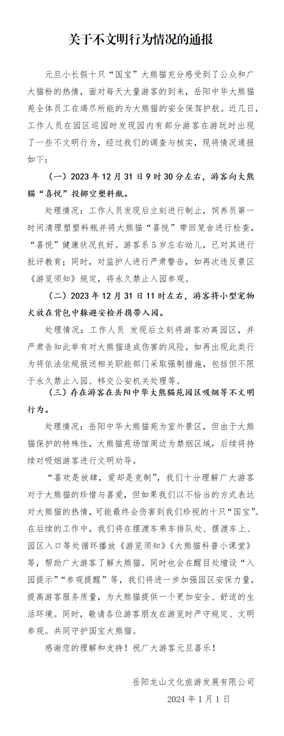 中新網1月2日電 據湖南省岳陽市南湖動物園有限公司官方微信消息,近幾日,工作人員在園區(qū)巡園時發(fā)現園內有部分游客在游玩時出現了一些不文明行為,2023年12月31日9時30分左右,有游客向大熊貓“喜悅”投擲空塑料瓶。