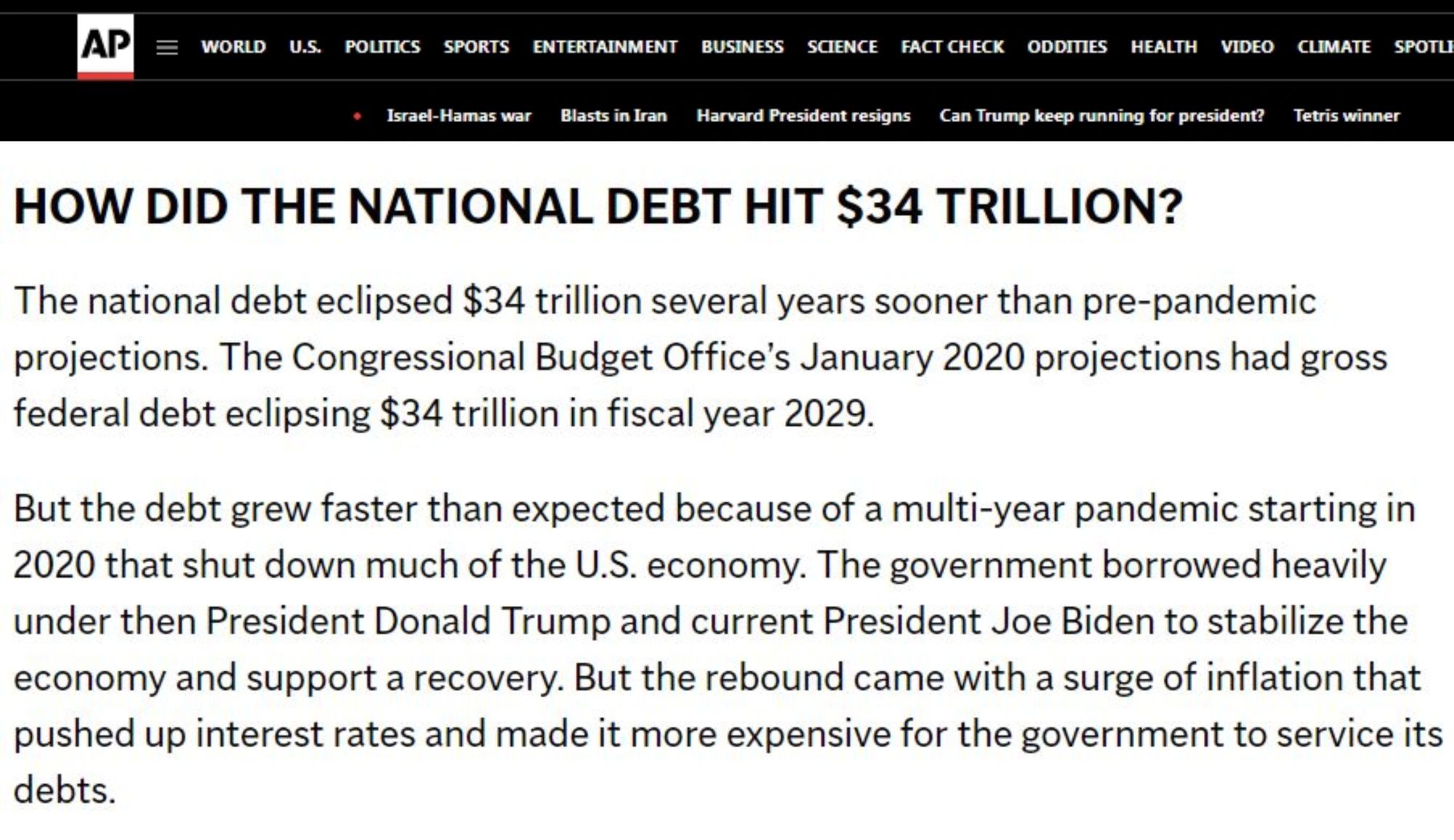 美聯(lián)社的報(bào)道指出,正是由于投資者長(zhǎng)期以來愿意借錢給美國(guó)政府,后者才得以在不增加稅收的情況下持續(xù)花錢。“但未來幾十年的債務(wù)路徑可能會(huì)危及美國(guó)的國(guó)家安全和主要支出項(xiàng)目,包括社會(huì)保障和醫(yī)療保險(xiǎn)”。
