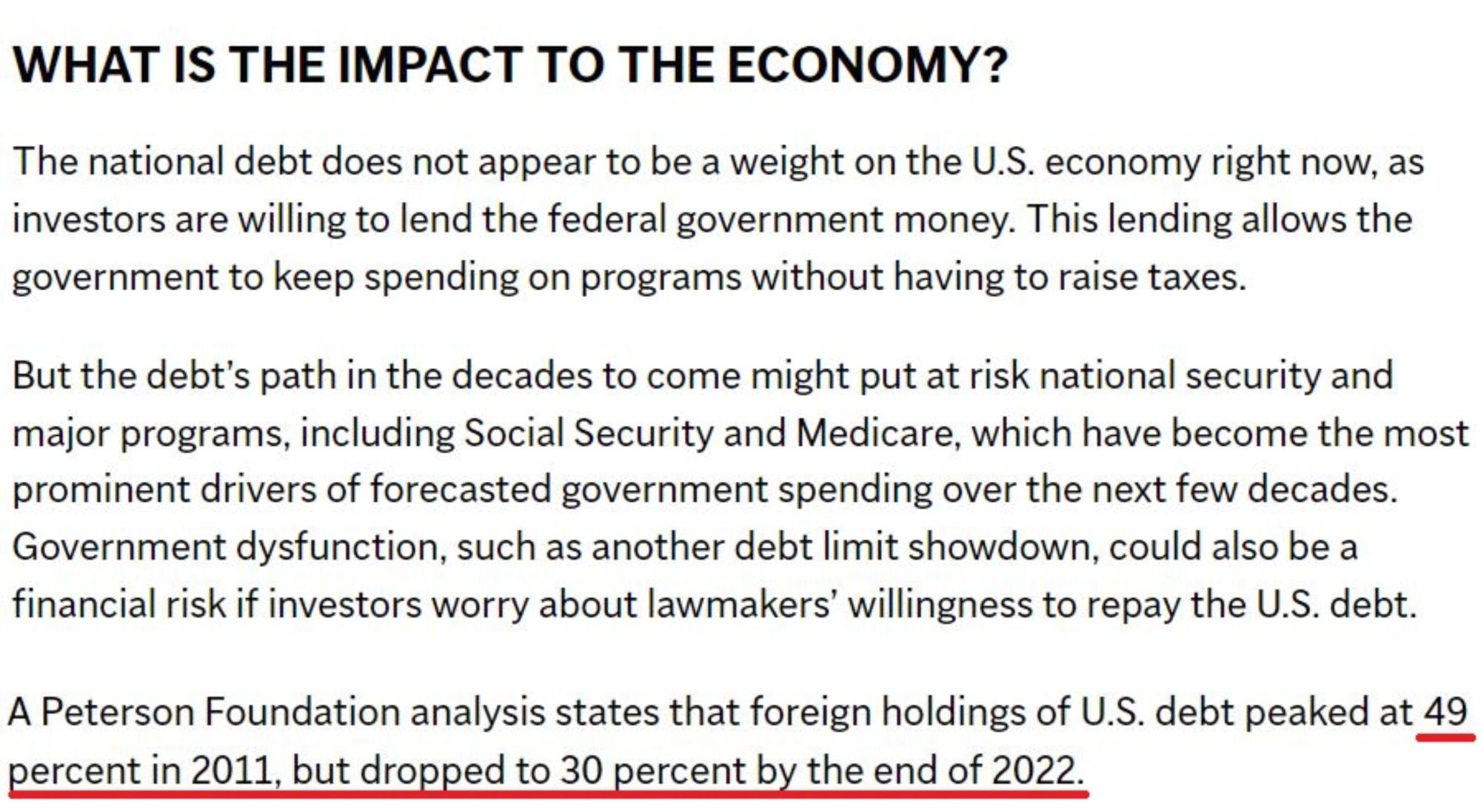 按照美國(guó)獨(dú)立權(quán)威經(jīng)濟(jì)研究智庫(kù)——彼得森基金會(huì)的說法,規(guī)模龐大且不斷增加的債務(wù)“正威脅著美國(guó)的經(jīng)濟(jì)未來”,因?yàn)樵缇痛嬖诘摹敖Y(jié)構(gòu)性驅(qū)動(dòng)因素”已經(jīng)讓美國(guó)財(cái)政政策走上了一條“不可持續(xù)的道路”。