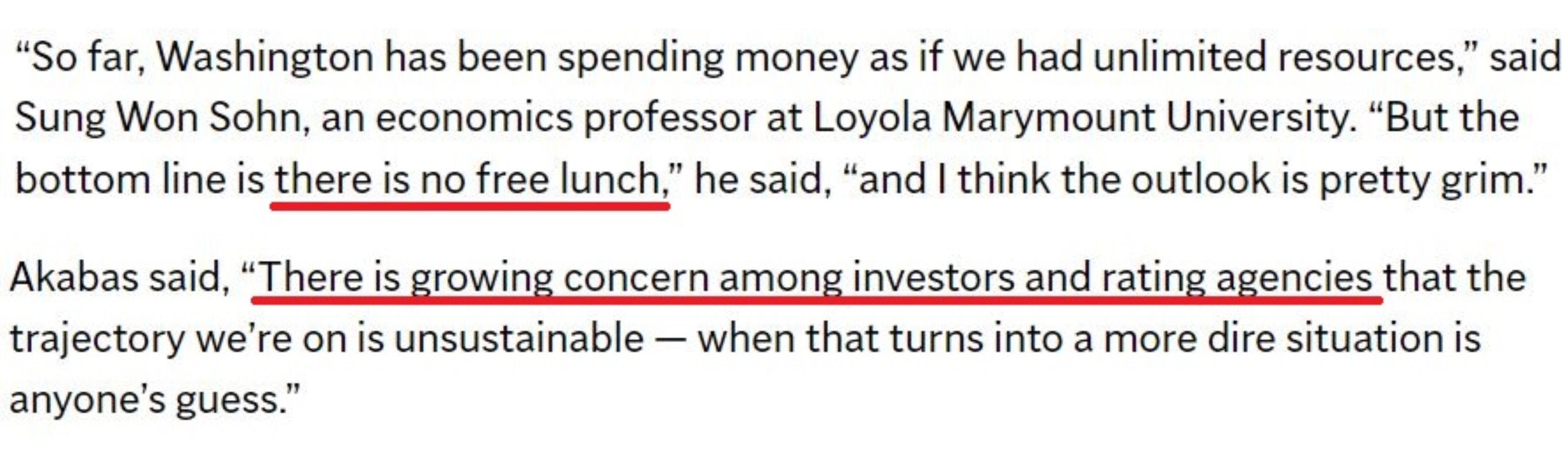 用洛杉磯洛約拉馬利蒙特大學(xué)經(jīng)濟(jì)專家的話說,“到目前為止,華盛頓一直在花錢,好像我們擁有無限的資源,但天下終究沒有免費(fèi)的午餐”。
