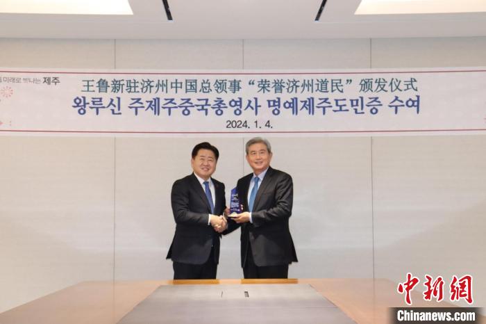 中新社韓國濟州1月4日電 韓國濟州道知事吳憐勛4日向中國駐濟州總領(lǐng)事王魯新頒授“榮譽濟州道民”證書。