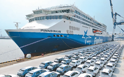 2023年7月25日,油電混合動(dòng)力高端客滾船“Finnsirius”號(hào)在山東港口煙臺(tái)港裝載商品車。