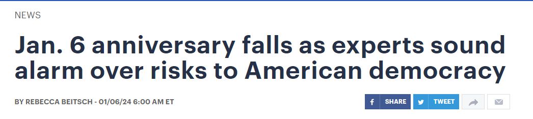 這項(xiàng)民調(diào)結(jié)果公布之時(shí),正值“國會(huì)山騷亂”事件三周年之際,美國也迎來新的選舉年。《國會(huì)山報(bào)》網(wǎng)站在6日的報(bào)道中再次提到,目前美國出現(xiàn)了一系列與民主狀況有關(guān)的令人不安的跡象。
