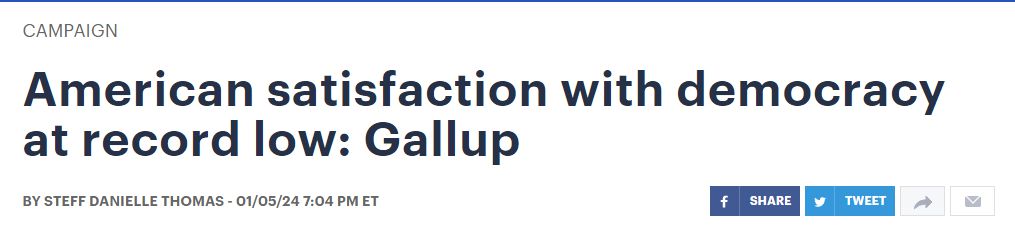 中國日?qǐng)?bào)網(wǎng)1月8日電 據(jù)美國《國會(huì)山報(bào)》網(wǎng)站5日?qǐng)?bào)道,蓋洛普公司(Gallup)5日公布的民調(diào)顯示,只有28%的美國成年人對(duì)該國的民主現(xiàn)狀感到滿意,較2021年1月6日美國“國會(huì)山騷亂”事件發(fā)生后不久的35%的調(diào)查結(jié)果又有了明顯的下降,創(chuàng)歷史新低。