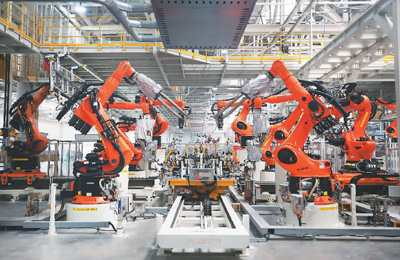 圖為在安徽合肥拍攝的大眾安徽模塊化電驅(qū)動(dòng)平臺(tái)工廠車身車間一角。