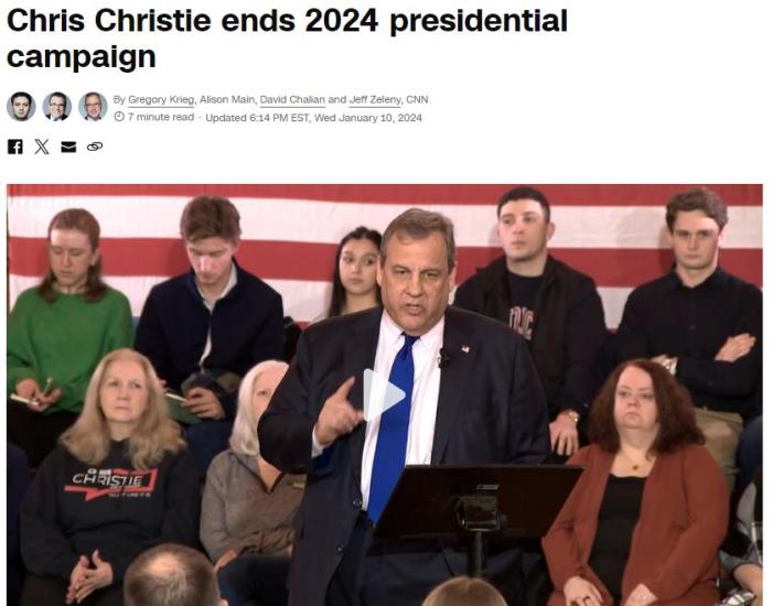 中新網(wǎng)1月11日電 綜合外媒報(bào)道,美國前新澤西州州長克里斯蒂(Chris Christie)當(dāng)?shù)貢r間10日宣布結(jié)束2024年美國總統(tǒng)競選。盡管克里斯蒂作為初選“戰(zhàn)場”上前總統(tǒng)特朗普的主要批評者而備受關(guān)注,但他并未能在民調(diào)中獲得廣泛支持。