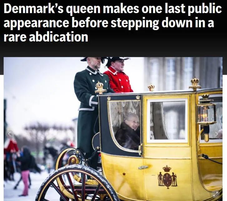 當(dāng)?shù)貢r(shí)間1月4日,是丹麥女王瑪格麗特二世最后一次以君主身份公開(kāi)露面。現(xiàn)年83歲的女王乘坐“金馬車(chē)”穿過(guò)丹麥?zhǔn)锥迹簧倜癖娒爸鴩?yán)寒、強(qiáng)風(fēng)和雨雪,在沿途為她揮舞旗幟并歡呼。