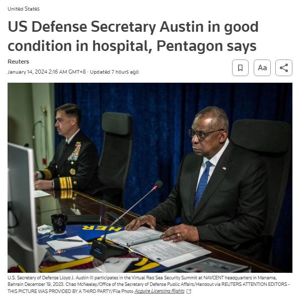 中新網(wǎng)1月14日電 據(jù)路透社報道,當?shù)貢r間13日,美國五角大樓表示,美國國防部長奧斯汀仍在醫(yī)院接受治療,目前“身體狀況良好”。