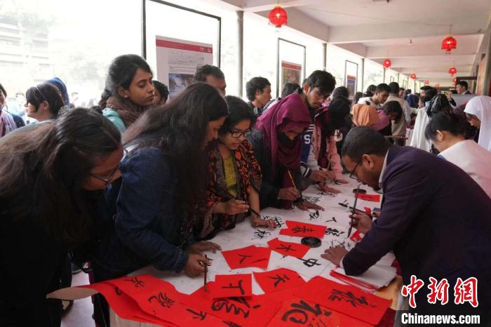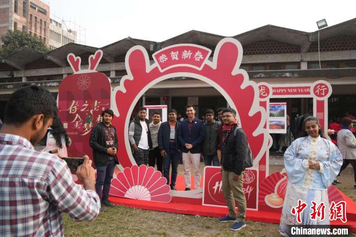此次活動,受到達(dá)卡大學(xué)師生及當(dāng)?shù)孛癖姷臍g迎。數(shù)百份“?!弊?、春聯(lián)、年畫、中國結(jié)、燈籠,營造濃濃的節(jié)日氛圍;近3000人次學(xué)生體驗(yàn)寫福字、穿漢服等傳統(tǒng)文化;精彩的舞獅表演贏得陣陣喝彩;“恭賀新春”打卡區(qū)更是排起長龍……