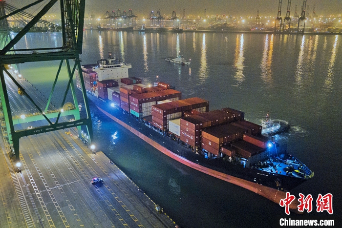 1月16日晚,裝載著2500余噸智利車?yán)遄拥拇笮图b箱班輪“巴赫”號,順利抵達(dá)天津港太平洋國際集裝箱碼頭,標(biāo)志著天津港與南美洲直航的首條“車?yán)遄涌炀€”正式開通?!败?yán)遄涌炀€”始發(fā)于智利圣安東尼奧港,直抵天津港。未來一周,還將有2艘次智利車?yán)遄迂洿诌_(dá)天津港,累計8300噸車?yán)遄蛹捌渌厦乐蕻a(chǎn)品從天津港上岸。(無人機照片) 中新社記者 佟郁 攝