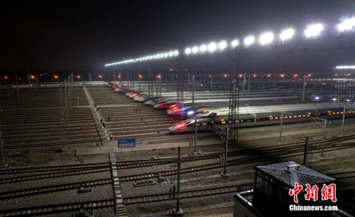 資料圖:航拍動車組??吭谖錆h動車段的存車線上,蓄勢待發(fā)。 張暢 攝