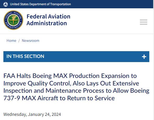 中新網(wǎng)1月25日電 當?shù)貢r間1月24日,美國交通部發(fā)布公告稱,美國聯(lián)邦航空管理局(FAA)批準了必須對每架停飛的波音737 MAX9型飛機執(zhí)行徹底的檢查和維護程序,檢查維護完成后這些飛機才有資格恢復(fù)運營。