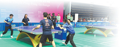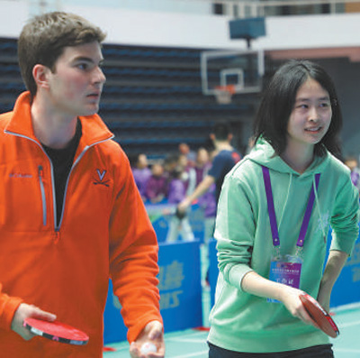弗吉尼亞大學(xué)學(xué)生米莎與清華大學(xué)學(xué)生曾加寶組成搭檔。在練習(xí)環(huán)節(jié)中,對手朝著米莎的方向打來一記高難度弧圈球,米莎一時間有些不知所措,只聽曾加寶喊了一句“我來”,便眼疾手快地沖了過去,擋在米莎前面,接住了這個球。這有趣又溫馨的一幕,引來了現(xiàn)場觀眾的掌聲,也瞬間拉近了兩個年輕人的距離?!拔业拇顧n一直鼓勵我,耐心地指導(dǎo)我握拍、擊球。我們一起討論乒乓球和學(xué)業(yè),現(xiàn)在已經(jīng)成了朋友?!泵咨f。