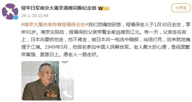 中新網(wǎng)1月31日電 據(jù)侵華日軍南京大屠殺遇難同胞紀念館官方微博消息,南京大屠殺幸存者程福保于2024年1月30日去世,享年91歲。