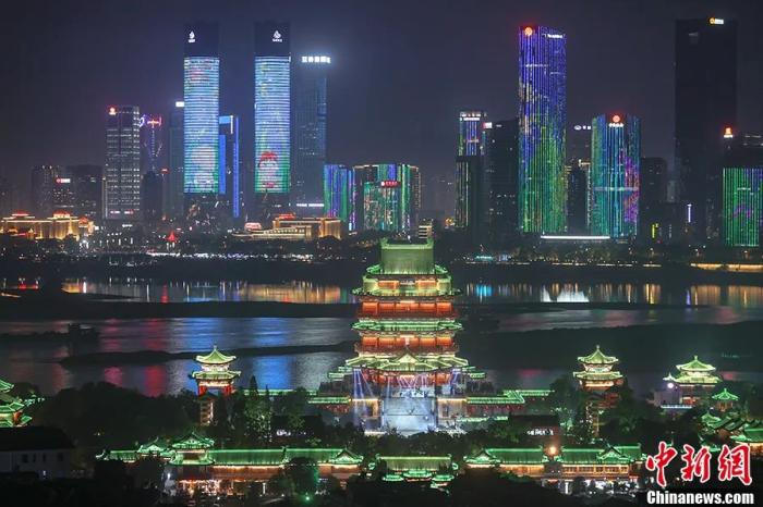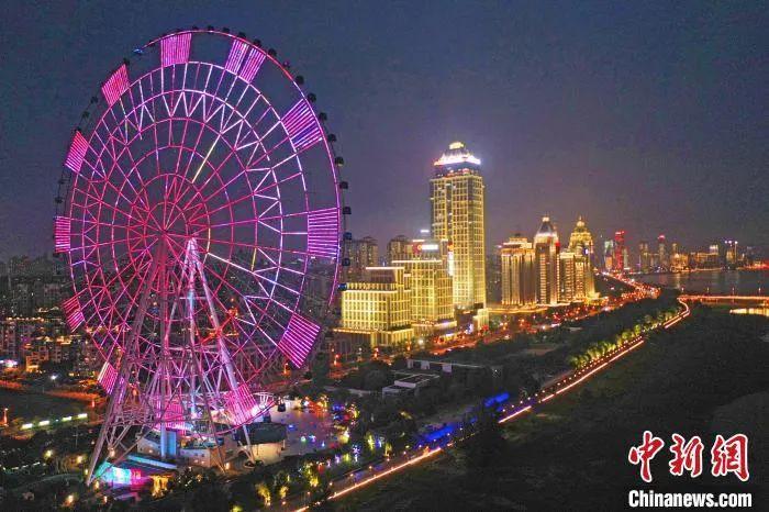矗立在贛江之畔的“南昌之星”摩天輪亮起絢麗的燈光,與沿江的高層建筑交相輝映。劉占昆 攝