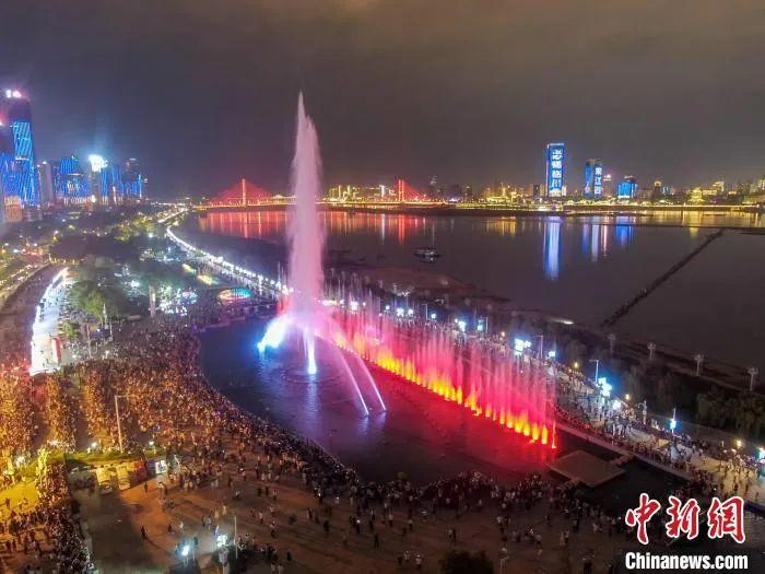 流光溢彩的映月噴泉在江畔夜色中合奏出光電交響曲……