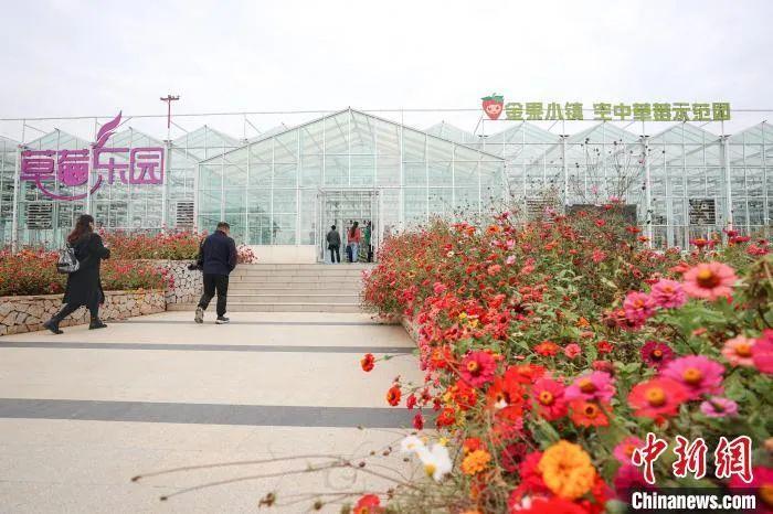 圖為南昌安義縣喬樂(lè)鄉(xiāng)的金果小鎮(zhèn)空中草莓示范園,游客走進(jìn)園內(nèi)參觀。劉力鑫 攝