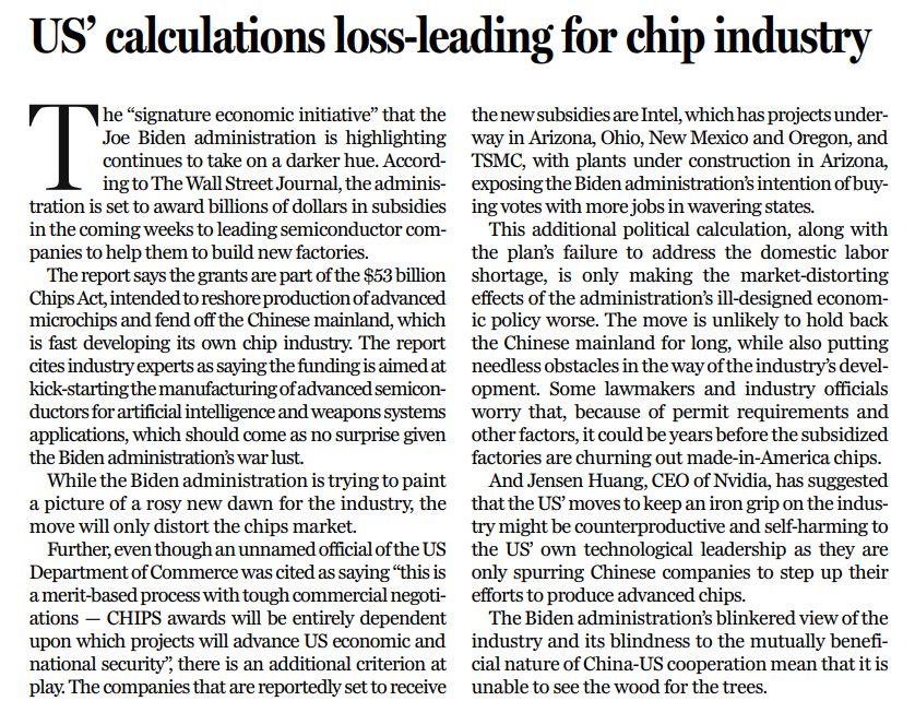 拜登政府試圖將半導(dǎo)體產(chǎn)業(yè)描繪為前途一片光明的朝陽(yáng)產(chǎn)業(yè),但其做法只會(huì)導(dǎo)致市場(chǎng)扭曲。