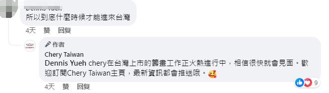 早前,奇瑞官方在臉書創(chuàng)立“Chery Taiwan”,并從去年開始更新專業(yè)內(nèi)容,針對一款中型運(yùn)動型多用途汽車已多次發(fā)布宣傳影片。有不少臺灣網(wǎng)友在該賬號咨詢該款汽車何時會在臺灣上市,該賬號回復(fù),目前在臺灣上市的籌劃工作正火熱進(jìn)行中,相信很快就會見面。