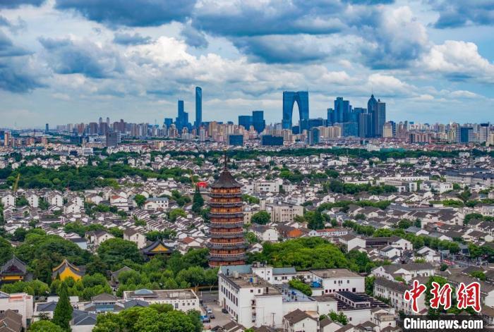 資料圖:蘇州古城近處的北寺塔與遠(yuǎn)處的現(xiàn)代樓宇相呼應(yīng)。 泱波 攝