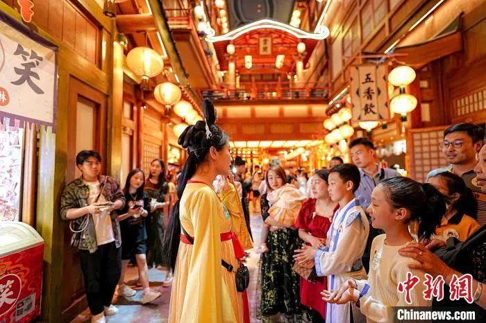 圖為游客在“長(zhǎng)安十二時(shí)辰”沉浸式唐風(fēng)市井生活街區(qū)體驗(yàn)、游覽。 滕瀚 攝