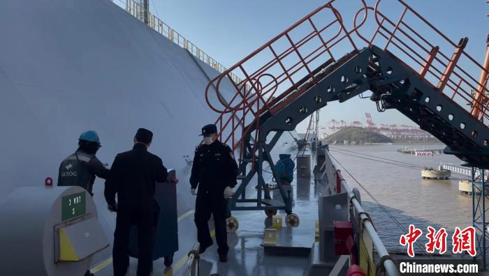 洋山邊檢站民警登輪對(duì)液化天然氣運(yùn)輸船實(shí)施入境核查。(李娜 攝)